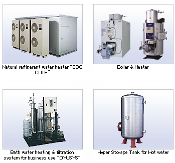 To ensure that living lives' comfortable environment is getting inevitable theme in global warming present day. Our Environment & Air Conditioning Equipment Division has various products or system of air conditioning and water filtration from business use to household use, such as boilers, heaters, Fan Coil Unit, Air Handling Unit, bath water heating & filtration system, and air cleaners. These environment-friendly products or system contribute to save water, and to keep air clean. We continue our business expansion based on air and water treatment, still try to create healthy and comfortable environment through active development of product that answers the needs of the age. Natural refrigerant water heater "ECO CUTE" Boiler & Heater Fan Coil Unit Bath water heating & filtration system for business use "OYUSYS" Hyper Storage Tank for Hot water Panel Heater Homed bath water heating & filtration system "BATHPOKA" Stainless foil heating resistor